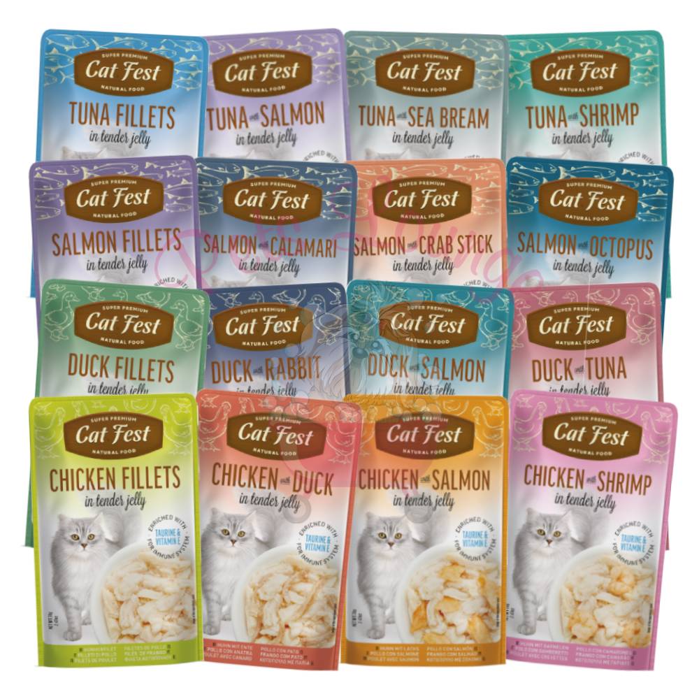 Cat Fest Tender Jelly for Cats 70g is a wet cat food available in 16 different flavors, featuring combinations of tuna, chicken, duck, and salmon with seafood like shrimp, sea bream, rabbit, crab, calamari, and octopus. The tender jelly texture is likely appealing to many cats and provides hydration alongside a flavorful meal.