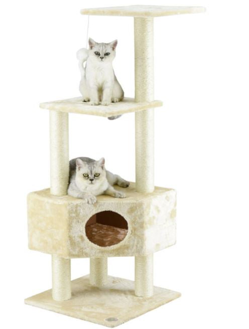 This Go Pet Club 51″ Wood Cat Tree in Beige, is beautifully designed cat tree that complements most home decors. It also features fun activities for your pet. This simple yet contemporary looking cat tree will indeed be your pet’s favorite fun place. The 51″ Wood Cat Tree in Beige from Go Pet Club is made using manufactured wood that makes it highly durable and sturdy. It has a beige finish that complements most home decors. It is covered using faux fur, which is soft to touch. The cat tree is contemporary in style and has three elevated platforms, which can accommodate multiple cats. It has multiple scratching posts, which are covered using sisal rope. The cat tree features a condo and a hanging toy to keep your pet active and playful. The cat tree requires minor assembly and can be fixed using Allen wrench. This cat tree is made using non-toxic material, thus ensuring safety to both your family and pets. In addition to this, it is easy to clean. Just wipe it clean using a damp cloth and regular liquid soap. The cat tree is manufactured by Go Pet Club, a well-known name, recognized for producing an excellent quality cat trees and pet beds.