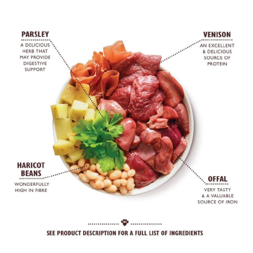 This mouth-watering Great British Breakfast wet dog food recipe in a tray is just the right size for smaller dogs. Nutritionally complete and naturally delicious, your furry friend can tuck into lean venison sausage meat, with ham, and haricot beans and a sprinkle of parsley for their morning spread. Even our mouths are salivating at the thought.