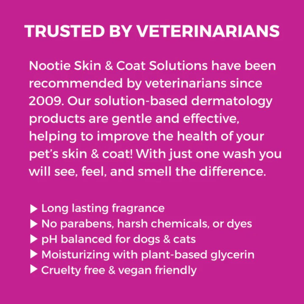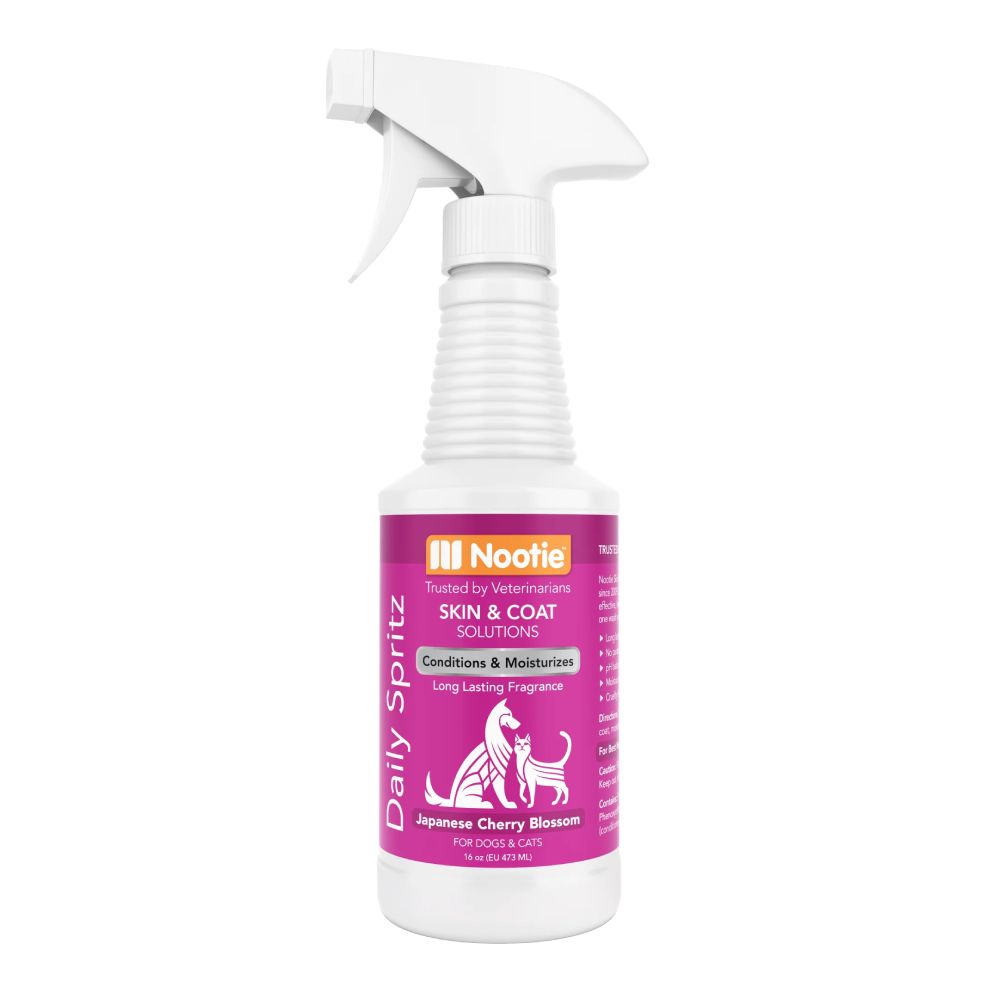 Nootie's Daily Spritz with our exotic Japanese Cherry Blossom fragrance will keep your dog smelling fresh and clean between baths while conditioning the skin and coat. Nootie's Daily Spritz is made with natural ingredients and is soap and paraben free.- It's long lasting and made with a gentle, conditioning formula that contains no sulfates or harsh chemicals- Safe to use with topical flea and tick productsIngredientsPurified Water, SDA 40 Alcohol, Nonoxynol 9, Polyquat 7, Glycerin, infused with essence of Japanese Cherry Blossom, Preservative16 oz
