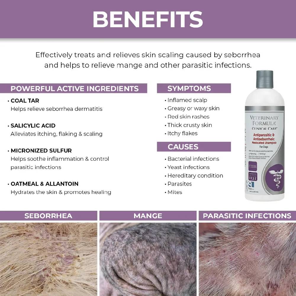 Synergy Lab's Veterinary Formula Clinical Care Antiparasitic & Antiseborrheic Shampoo for Dogs is a proven remedy for combating seborrhea mange and other parasitic and fungal skin infections. By shampooing your pet 2-3 times a week initially and then gradually decreasing frequency as their skin improves, you can provide relief from symptoms such as scalp inflammation, greasy skin rashes, and scaly skin resembling dandruff. This veterinary-grade shampoo contains powerful ingredients like salicylic acid, coal tar, and micronized sulfur to target symptoms, while colloidal oatmeal and allantoin work to hydrate and heal the skin. This shampoo can even be used in conjunction with other topical flea and tick treatments without washing them away. Perfect for pets with sensitive or yeast-prone skin, this shampoo is an essential for any pet owner.